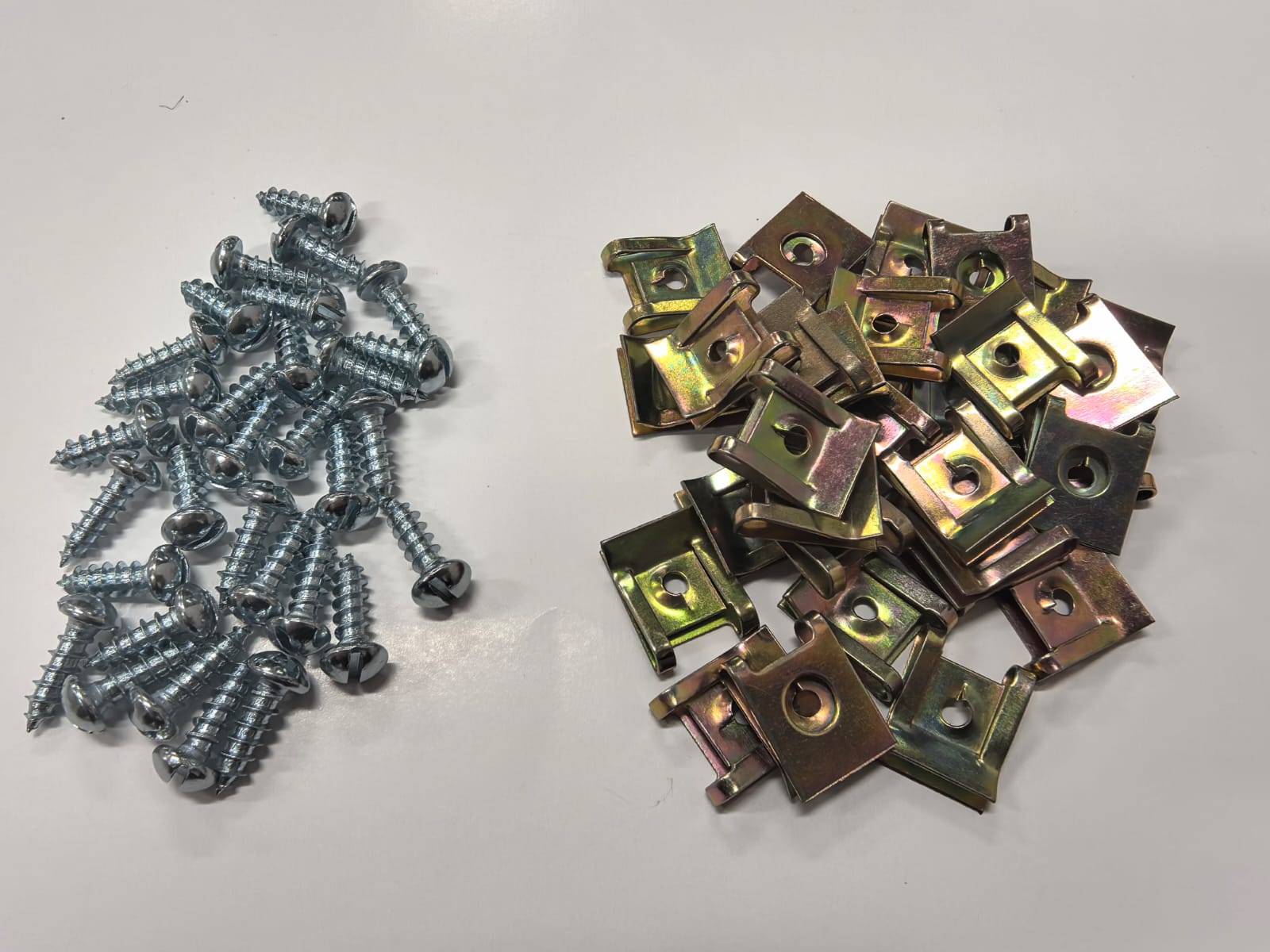 саморез автомобильный - 100 штук скоба под саморез автомобильная - 100 штук это универсальный крепеж, подойдет, почти на любой автомобиль! саморезы автомобильные со скобой; скоба под саморез; саморез с клипсой; автомобильные саморезы; саморезы с закладными Универсальный автомобильный крепеж: саморезы с пружинной скобой M5 Краткое описание: Набор универсального крепежа для быстрого и надежного монтажа элементов в автомобиле. В комплекте 100 саморезов и 100 пружинных скоб (клипс) размера M5. Широко применяется для установки брызговиков, подкрылков, облицовки и других элементов. Полное описание: Ключевые преимущества: Универсальность: Крепеж совместим с многими марками автомобилей, включая VAG, KIA, Лада, Toyota и другие. Полный комплект: В набор входит все необходимое — 100 саморезов и 100 ответных пружинных скоб (закладных клипс). Надежная фиксация: Пружинная скоба обеспечивает плотный прижим и надежное крепление детали, предотвращая самопроизвольное откручивание. Простота установки: Монтаж не требует специального инструмента или навыков. Саморез легко вкручивается в скобу, которая фиксируется в монтажном отверстии. Коррозионная стойкость: Цинковое защитное покрытие обеспечивает долговечность крепежа в условиях эксплуатации автомобиля. Область применения: Предназначен для крепления различных элементов кузова и облицовки: Брызговики (подкрылки, локеры) Защита картера двигателя Элементы внутренней облицовки арок Некоторые виды бамперов и спойлеров Декоративные накладки и молдинги Комплект поставки: Автомобильный саморез M5 — 100 штук Скоба (клипса) пружинная закладная M5 — 100 штук Ключевые слова для поиска: автомобильный саморез, скоба под саморез, саморез с клипсой, крепеж для подкрылка, метизы автомобильные, саморезы M5, скоба закладная, крепление брызговика, универсальный крепеж, VAG, KIA, Лада, Toyota, Hyundai, Renault, Ford, хомуты автомобильные, пистоны, клипсы, пружинная скоба.